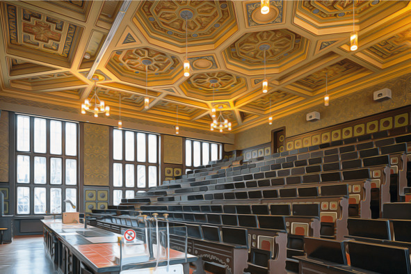 Аудитория была освещена тёплым светом от люстр на красивом узорчатом потолке. Он имел голубого цвета орнаменты, которые уходили ещё глубже, золотого цвета вставки лишь подчёркивали роскошность помещения. Стулья были с мягкой чёрной обивкой на фоне тёмного дерева. Высокие стены имели обои с рисунком мозаики, большие окна пропускали дневной свет. Стол в конце аудитории был длинным и стоял на низком пороге. А за ним уже была установлена сцена. Зеленая доска расстилалась почти по всей стене. Всех участников определили на передний ряд, который сразу занялся портфелями с документами.