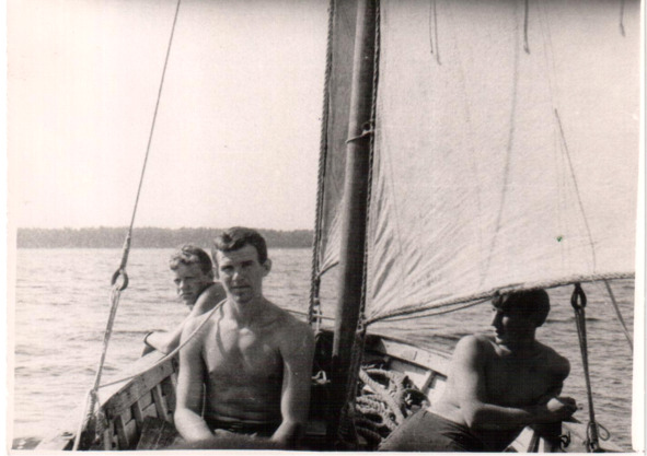 Первый выход на шлюпке под парусом. Лёша Обожин, Женя Воробьёв, боцман дядя Боря и я на руле