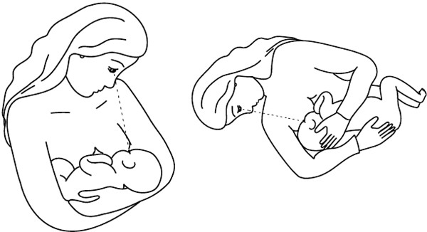 2. Положение головы на сгибе локтя, хоть и привычно, но усложняет сосание. В позе «колыбельки» смещайте малыша примерно на 1/3 расстояния от сгиба локтя до кисти. При этом ваше предплечье параллельно вашему туловищу.