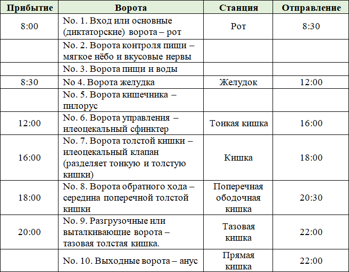 Паузы, необходимые для этих особых процессов, обеспечиваются так называемыми «воротами», с помощью которых временно останавливается продвижение каждого кусочка пищи, пока в нем идут такие процессы как переваривание, поглощение или отбор для продвижения дальше.