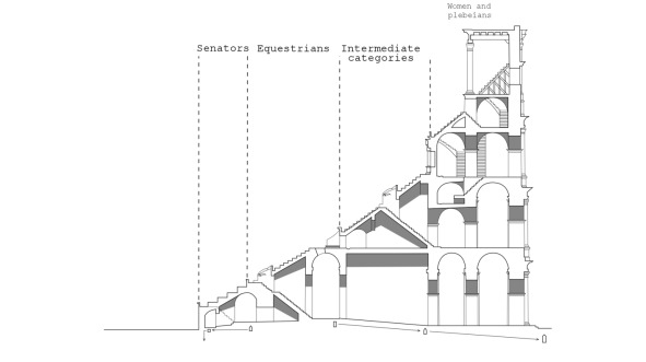 Aйлана бўйича у деярли 500 м га етган. Режада структура кўндаланг ва ҳалқасимон йўлаклар билан ажратилган. Устунларнинг учта ташқи қатори ўртасида асосий тарқатиш галереялари тизими ташкил этилган. Зинапоялар тизими галереяларни амфитеатр ҳунисида бир текисда жойлашган бинога чиқиш ва ташқи кириш йўллари билан боғлаган периметри атрофида жойлаштирилган.