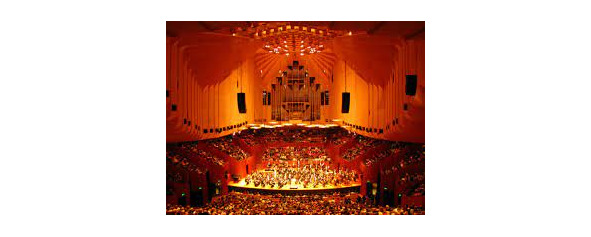 Aслида, бу бино органик архитектуранинг асосий тамойилларини амалга оширади. Лойиҳа 14 йил давом этди. Бинонинг концепцияси оддий: иккита амфитеатр ўрнатилган платформа. Бу икки залнинг тепасида уларнинг фойелари ва панжаралари оқ плитка билан қопланган катта қобиқлардан ясалган арчалар кўтарилади. Бино 2,2 гектар майдонни эгаллайди. Унинг узунлиги 185 м, максимал кенглиги 120 м. Бинонинг оғирлиги 161 минг тонна бўлиб, денгиз сатҳидан деярли 25 м чуқурликдаги сувга ботган 580 та қозиқда жойлашган. Тингловчилар ва меҳмонлар катта зинапоя, ҳайкалчали бетон нурлар остидан юриб, шаҳар томонидан бинога яқинлашадилар; кейин улар асосий платформа даражасига кўтарилади ва қабулхонага киради.