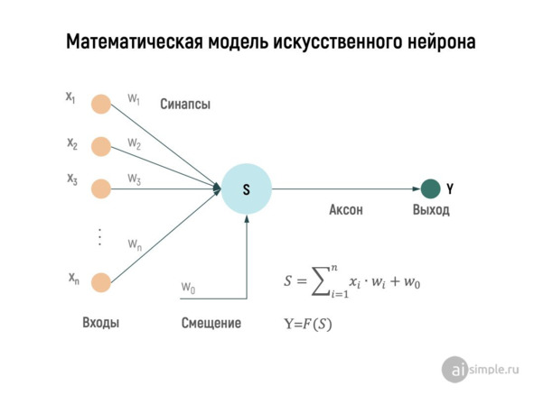Искусственный нейрон (Artificial neuron) это математическая функция, задуманная как модель биологических нейронов, нейронная сеть. Разница между искусственным нейроном и биологическим нейроном представлена на рисунке. Искусственные нейроны это элементарные единицы искусственной нейронной сети. Искусственный нейрон получает один или несколько входных сигналов (представляющих возбуждающие постсинаптические потенциалы и тормозные постсинаптические потенциалы на нервных дендритах) и суммирует их для получения выходного сигнала (или активации, представляющего потенциал действия нейрона, который передается по его аксону). Обычно каждый вход взвешивается отдельно, а сумма проходит через нелинейную функцию, известную как функция активации или передаточная функция. Передаточные функции обычно имеют сигмовидную форму, но они также могут принимать форму других нелинейных функций, кусочно-линейных функций или ступенчатых функций. Они также часто являются монотонно возрастающими, непрерывными, дифференцируемыми и ограниченными390,391.