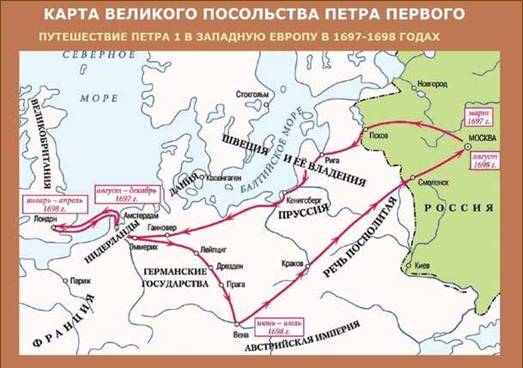 Третьим важным событием в морском становлении будущего императора России была его первая и длительная поездка за границу в Западную Европу (16971698), где он был в составе Великого посольства под именем десятника Петра Михайлова. Эта поездка преследовала в основном морские цели: изучить опыт строительства кораблей и организации военного флота в ведущих морских державах, на- брать за границей на русскую службу опытных кораблестроителей и профессионалов-моряков, а так- же заручится поддержкой и помощью у правителей западных стран в борьбе с турками за выход России к Черному морю. По содержанию это было богатое и насыщенное интересными событиями настоящее морское заграничное путешествие Петра I. Почти во всех странах он шел