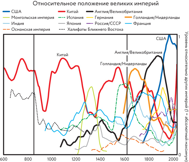 Теперь взглянем на тот же график, данные на котором расширены вплоть до 600 г. н. э. Я предпочитаю сосредоточиться на первом графике (охватывающем последние 500 лет), а не на втором (охватывающем 1400 лет), поскольку на нем показана картина империй, которые я изучал более тщательно.