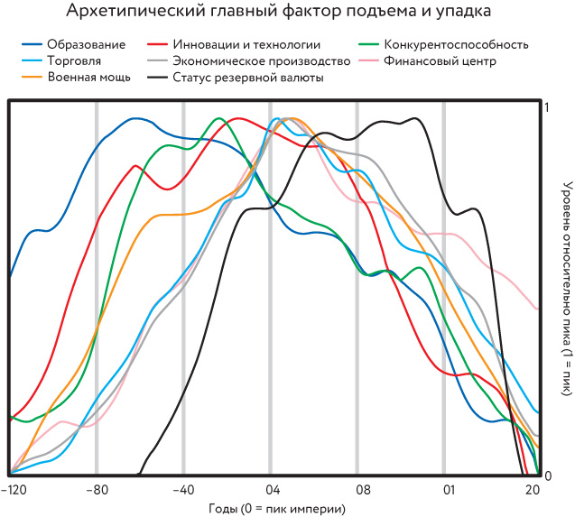 Линии на графике позволяют легко увидеть, как и почему происходят подъемы и падения. Можно заметить, что рост образования ведет к росту инноваций и развитию технологий, что на следующем этапе обусловливает увеличение доли в мировой торговле и военной мощи, укрепление экономического производства, создание ведущего мирового финансового центра а через некоторое время закрепление статуса валюты в качестве резервной. Вы можете видеть, как в течение достаточно долгого периода большинство из этих факторов сохраняют силу, которая затем начинает уменьшаться по аналогичной траектории. Общая резервная валюта, подобно общему языку мира, остается некоторое время после того, как в империи начинается упадок, поскольку привычка к использованию сохраняется дольше, чем сами силы, вызвавшие его.