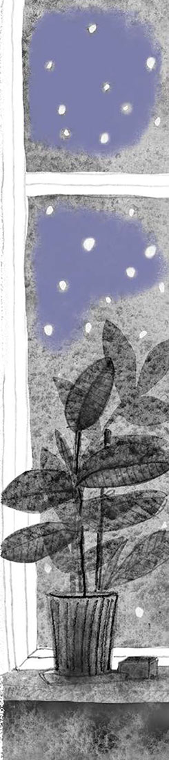 Ульке надоело рисовать. Она подошла к окну и стала смотреть. На улице совсем стемнело. Виднелись только освещённые серые дорожки и окна-огоньки в домах напротив. Улька подумала, что семьи в этих домах сейчас ужинают, а кто-то уже пьёт вечерний чай. С печеньем или конфетами.