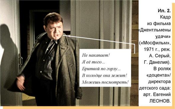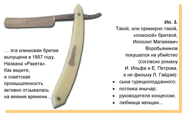 Помните? «Бритвой по горлу В колодце она лежит!». Для зрителей 1971 года, когда и вышел лучший фильм Г. Данелия «Джентльмены удачи», было понятно выражение «бритвой по горлу» Сегодняшнему, молодому, читателю и зрителю трудно представить: как это можно убить человека приспособлением для бритья волос? Станки для бритья так и сделаны, чтобы ни в коем случае не порезаться при бритье. Разве что подростковый прыщик срезать но это не смертельно.