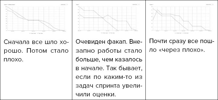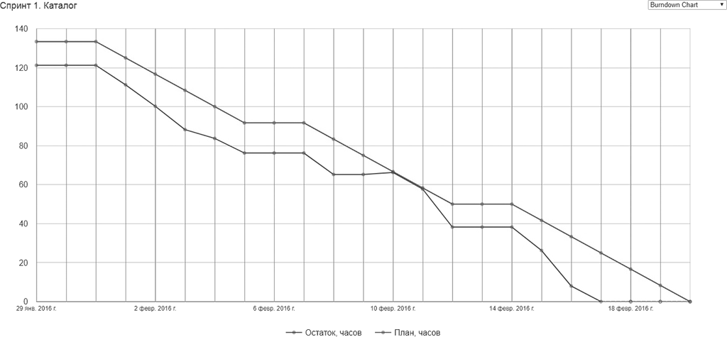 Синяя линяя фактически оставшееся время оцененных задач. Красная плановое время. Мы видим, как по ходу спринта «сгорала» работа. Команда доделала все намного раньше плана, однако во второй трети спринта линии совпали. Тут нужно внимание.