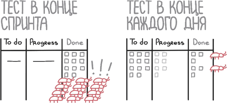 Во-вторых, часто отдельный тикет бессмысленно проверять, пока не готовы еще парочка связанных. В-третьих, держать тестировщика «на стреме», чтобы сидел и ждал, когда же наконец на него свалится пара задач на проверку малопродуктивная затея. В-четвертых, пока проект в руках разработчиков, его постоянно ломают и чинят.