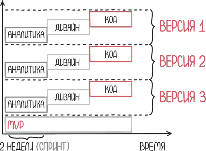 Для программистов, если они не шарлатаны, уже привычно работать итерациями. Какая-то функция на экране готова. Какая-то нет. В новых версиях в каждый спринт, добавляется что-то новенькое. Но в целом можно уже посмотреть, как ведет себя продукт.