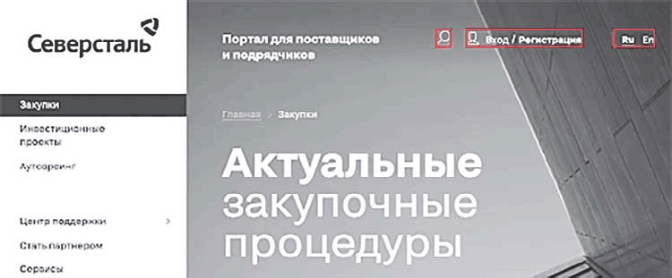 Одна из первых итераций портала Северсталь. Поиск, вход, регистрация и переключение языков еще не реализованы.