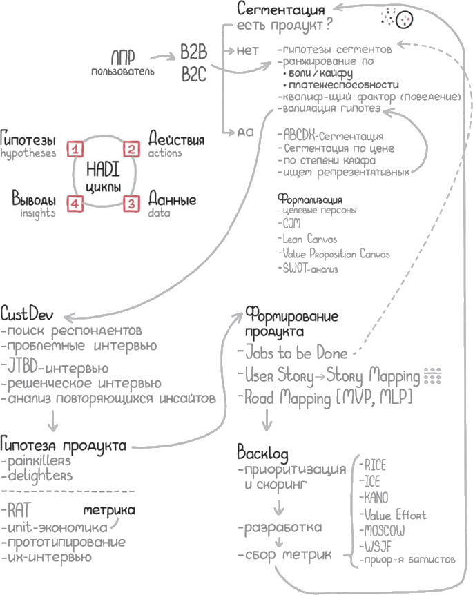 Для самого владельца продукта существует ряд дополнительных подходов: HADI-циклы, CustDev, методы сегментации пользователей и различные способы скоринга бэклогов.