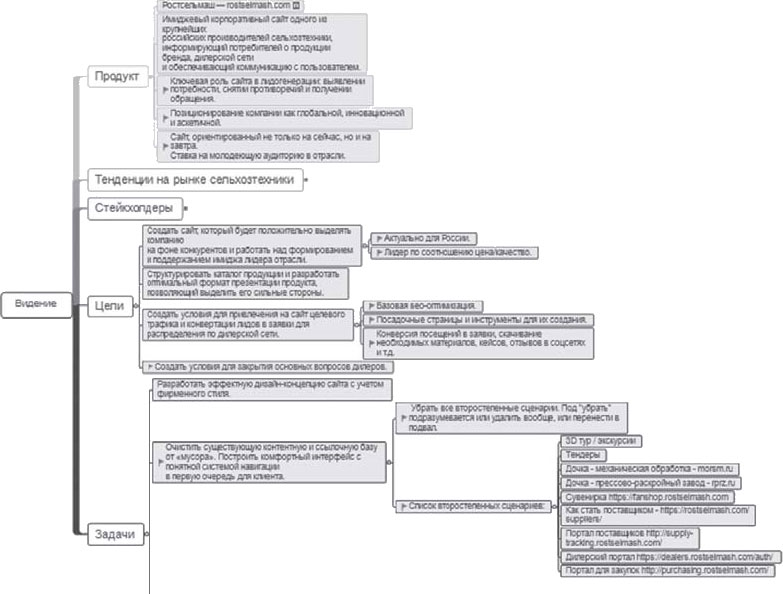 Эта техника лучше всего работает в заказной разработке. Либо когда уже в общих чертах понятна задача, осталось только вытащить детали из голов стейкхолдеров, примерить их на целевую аудиторию, убедиться, что не допущены ошибки конкурентов и учтены тренды отрасли. Подходит для большинства сайтов и мобильных приложений. Позволяет синхронизировать видение у заказчика и разработчика, а также довольно точно подсчитать бюджет разработки. Это, в основном, кабинетный анализ, который можно подкрепить интервью с потенциальными пользователями (см. главу о Customer Development) и A/B-тестами. В итоге у нас должна получиться структура будущего проекта. Для фиксации предлагаю использовать формат интеллектуальных карт.