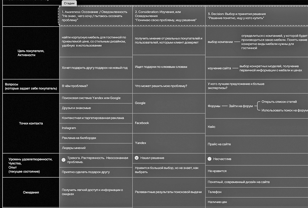 CJM обычно представляет собой табличку. По горизонтали мы выписываем шаги или фазы, через которые проходит пользователь. По вертикали те параметры, которые хотим отслеживать. Как правило, это:
