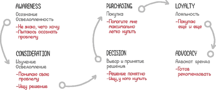 Итак. Наш покупатель проходит через 6 крупных, условных фаз: