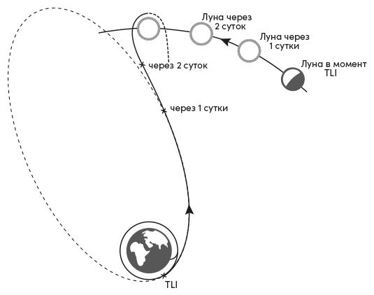 Первым (после, конечно, «Из пушки на Луну») транспортным средством, на котором люди отправились к Луне, был «Аполлон-8» в конце декабря 1968 г. Задача состояла в том, чтобы туда добраться (преодолев примерно 384 000 км), выйти на орбиту вокруг Луны, а затем, наоборот, уйти с нее и вернуться домой. За словами «выйти» и «уйти», как и «добраться» и «вернуться», стоят концентрированные смыслы и сложные технологические решения. Когда три ступени ракеты «Сатурн V» вывели «Аполлон-8» (вместе с третьей ступенью, которой предстояло еще поработать) на низкую околоземную, почти круговую орбиту, все системы корабля были проверены на предмет дальнейшего путешествия к Луне. Действия, необходимые для перехода на курс к Луне, надлежало выполнить в строго определенном месте траектории, которое на рис. 2.1 обозначено буквами TLI, что означает Trans Lunar Injection («переход на траекторию полета к Луне»). Сама «инъекция» состояла в точно дозированном включении двигателя третьей ступени при строго определенной ориентации корабля.