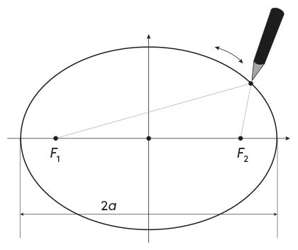 Рис. 1.1. Эллипс интереснее окружности. Он определен тем, что сумма расстояний от каждой его точки до двух фиксированных точек (фокусов) постоянна. Поэтому нарисовать эллипс проще всего, закрепив в этих точках концы нитки и держа карандаш так, чтобы нитка всегда была натянута. Показано расстояние 2a между двумя самыми удаленными друг от друга точками эллипса. Его половина, a, называется большой полуосью