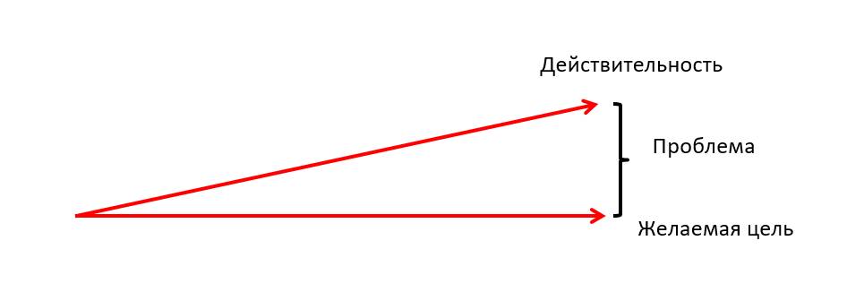 Он нарисовал стрелку. В конце приписал слово «желаемая цель», добавил одну стрелку, уходящую из той же точки в сторону. Над ней вывел слово «действительность». Поставил фигурные скобки между концами стрелок и приписал слово «проблема»