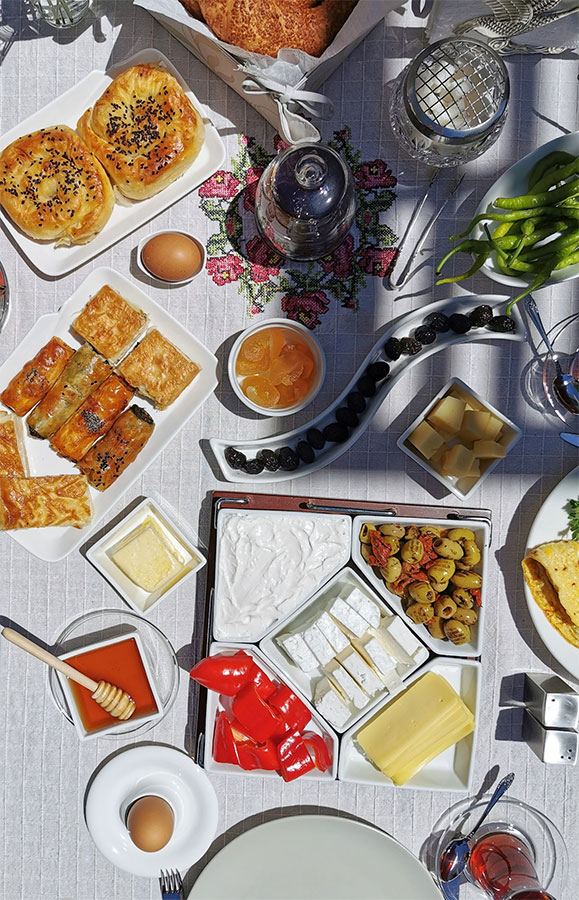 Турецкий завтрак это не просто приём пищи, это настоящий ритуал, событие, которое собирает всю семью и длится с утра и до позднего обеда по выходным. Однако и в будни перед турками на завтрак выстраивается целый ряд разноцветных тарелочек: оливки, сыр, мёд, варенье, овощи, яйца, свежий хлеб, а к ним ещё и выпечка