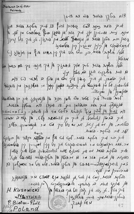 Письмо Х. Кусовицкого из Польши на идише, 20 июля 1939 года9