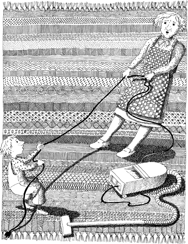 Но на мгновение он отвлекается. А бабушка, одним прыжком добравшись до внука, вырывает шнур у него из рук, снова вставляет вилку в розетку, и пылесос опять жужжит зур-р, зур-р. Бабушка вновь принимается пылесосить пол, мрачно приговаривая: