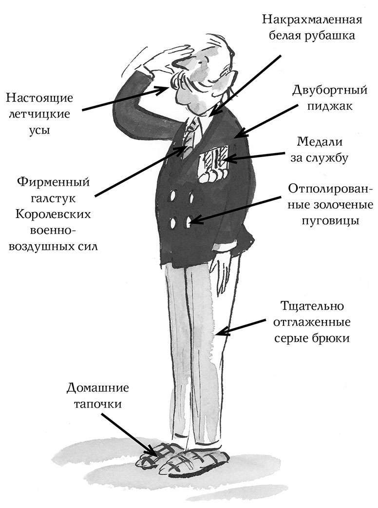 Он был всегда безукоризненно одет по всей форме: двубортный пиджак, накрахмаленная белая рубашка и тщательно отглаженные серые брюки. Шею неизменно обвивал аккуратно повязанный фирменный галстук военно-воздушного флота темно-бордовый с темно-синими и серебряными полосками. И усы дедушка носил по моде летчиков времен Второй мировой длинные и вразлет. Совершенно удивительные усы! Такие длинные, что сливались с бакенбардами. Получалась почти борода, только подбородок голый. Дедушка часами начесывал кончики усов, чтобы они торчали ровно под правильным углом.