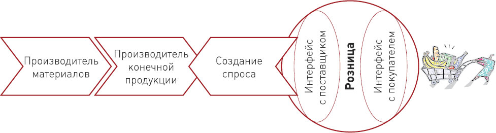 Любая розничная компания может быть представлена как двухсторонний бизнес-интерфейс: с одной стороны поставщики, с другой покупатели. Такой подход позволяет взглянуть на нее как на важный, но не единственный элемент в общей цепочке создания ценности для конечного покупателя, в которой также задействованы производители и поставщики, и выделить факторы успеха, в том числе отделить ценность продаваемых товаров от ценности розничной компании.