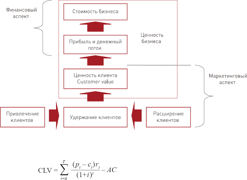Для оценки ценности клиента применяется следующая формула, учитывающая затраты и фактор времени (смотрите Рисунок 15), где T время «жизни» клиента, жизненного цикла клиента в компании, pt средняя цена, которую платит клиент в момент времени t, ct прямые затраты на обслуживание и поддержку отношений с клиентом в момент времени t, rt вероятность удержание клиента, AC стоимость привлечение данного клиента (или группы клиентов).
