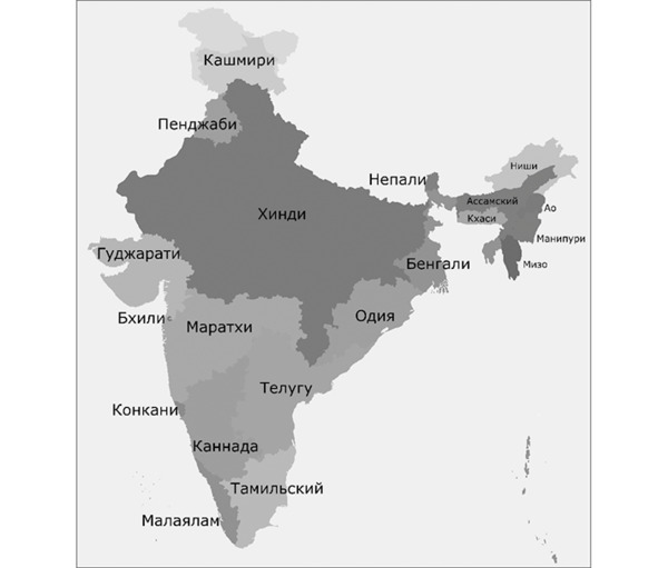 Адаптировано авторами по: https://commons.wikimedia.org/wiki/ File:Language_region_maps_of_India.svg