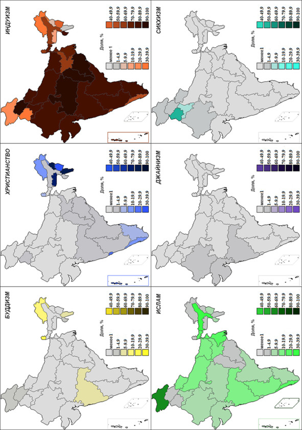Наиболее яркие контрасты современной Индии связаны с историей ее заселения. Различные волны колонизации и завоеваний, как в сосуд, вливались в индийский субконтинент с севера; каждая следующая волна только прижимала более раннюю к югу. На тему крайней культурной неоднородности страны интересны рассуждения И. Валлерстайна в эссе «Существует ли в действительности Индия?», где он выдвигает гипотезу, что условные Хиндустан (Северная Индия) и Дравидия (Южная Индия) могли бы сегодня существовать как два отдельных государства с принципиально различными культурами, народами, цивилизационным наследием. Однако история распорядилась иначе: британская колонизация субконтинента заложила основу для возникновения Индии в современных границах, куда, за некоторыми исключениями, вошли территории с преобладающим индуистским населением. Масштабы культурной неоднородности страны лучше всего иллюстрируются картами современного распространения языков и конфессий (рис. 2 и 3).