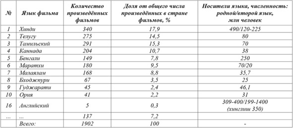 Интересно, что многоязычие Индии отчасти объясняет феномен «Болливуда» весомого количества фильмов, производимых индийским кинематографом (название феномена составлено из слов «Бомбей», это старое название города Мумбаи, и «Голливуд») см. таблицу 1. А главными языками, на которых говорят в фильмах хинди, телугу, тамильский, каннада, бенгали, маратхи и малаялам. Для примера, в рассмотренный период 20152016 годов на английском языке было выпущено лишь пять фильмов из 1902.