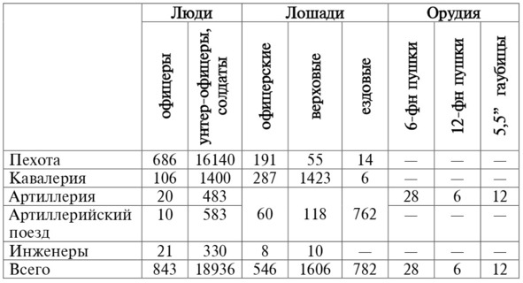Итого в дивизии: 12 эскадронов (106/1400/287/1423), артиллерия (5/153/12/78); всего 1664 чел., 1800 лошадей и 6 орудий.