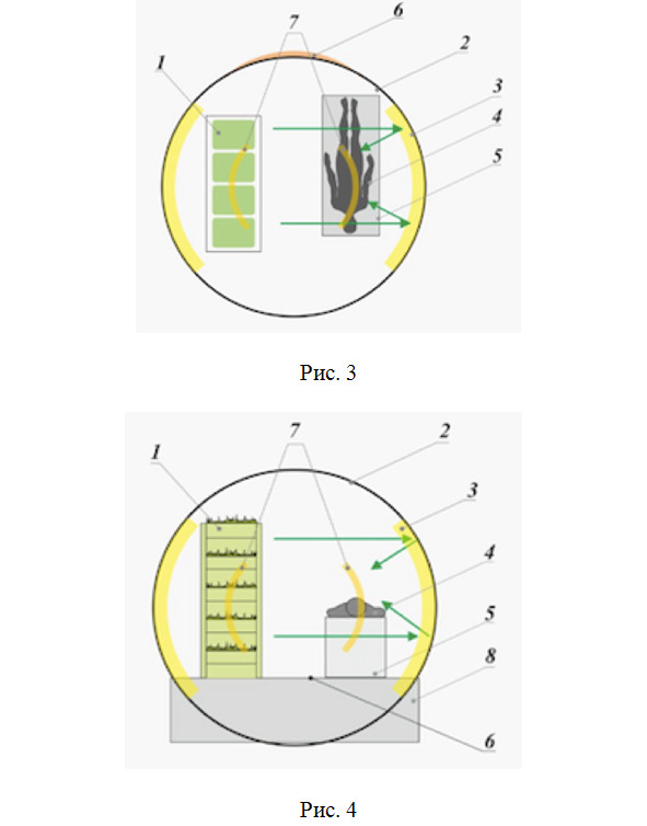 На рис. 3 и 4 изображен эскиз разреза Биотрона Цзяна. На этих эскизах желтым цветом изображены объемные, сферические фокальные зоны, которые формируются в районе середины радиуса сферы (90 см от центра). Расчетная толщина этих фокальных зон 13 см. На рис. 3 видно, что фокальная зона за счет кривизны практически не захватывает голову и ноги пациента. А на рис. 4 фокальная зона сильно выходит за пределы пациента. Высота стенда с растениями 180 см, а высота фокальной зоны на середине радиуса будет 90 см. При этом высота лежачего пациента всего около 20 см. Следовательно, в этой плоскости на пациента работает только около 25% излучения растений. Остальное излучение пролетает мимо. На рисунках 3 и 4 показаны: 1 стенд с растениями, 2 медная сфера, 3 активные части сферы, 4 пациент, 5 кровать, 6 дверь на рис. 3 или фундамент на рис. 4; 3, 7 сферические объемные фокальные зоны.
