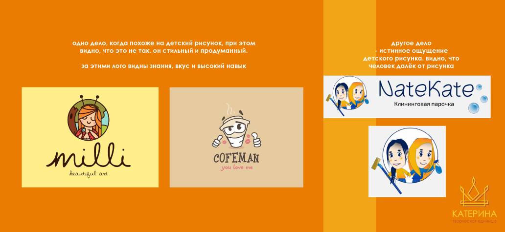 Но. Хочу сделать важную оговорку, навык рисования какой-то супербазовый (походить на курсы или тренироваться по урокам дома будет полезно) поможет вам рисовать логотипы, персонажей, крутые иллюстрации. Если вы делаете только рекламные макеты (или логотипы без персонажей и т.д., с графическими элементами) то можно и без рисунка. Просто больше практики и насмотренности. Важно развивать свои возможности и вкус. Потому что я натыкалась на дизайнеров, которые видно, что не умеют рисовать, но годами делают ставку именно на продукты, где этот скил важен. И при этом искренне не понимают, почему их работы так мало привлекают клиентов. Я о подобных работах (справа):