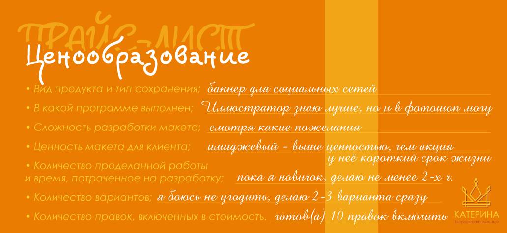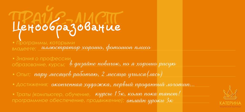 (-): Будут те, кто привлечется низким ценником и уйдут, узнав истинную стоимость оформления его проекта. Это может повлечь падение профессиональной самооценки.