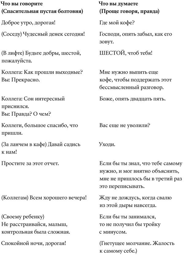 На мгновение представьте мир, в котором не существовало бы такого будничного обмана. Левая колонка это то, как могут звучать ваши понедельники, наполненные социальными любезностями. Правая то, как они бы выглядели без спасительной пустой болтовни.