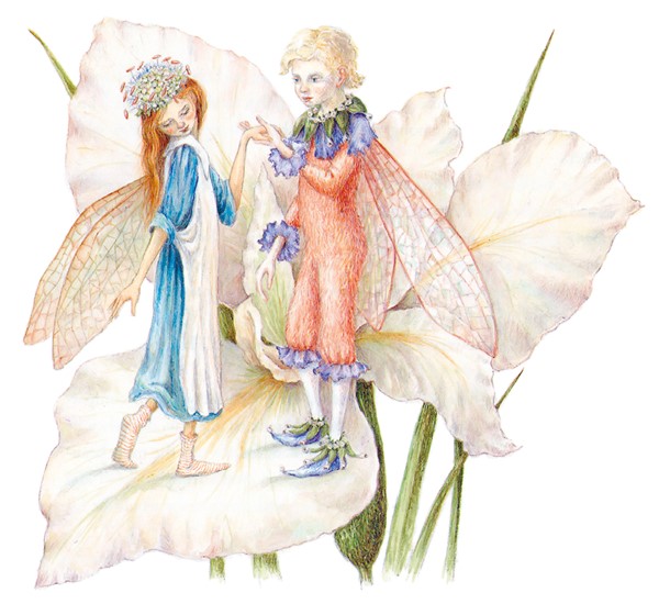 Внизу лежали большие куски мрамора это свалилась верхушка одной колонны и разбилась на три куска, между ними росли чудеснейшие крупные белые цветы. Ласточка спустилась и посадила девочку на один из широких лепестков. Но вот диво! В самой чашечке цветка сидел маленький человечек, беленький и прозрачный, точно хрустальный. На голове у него сияла прелестная золотая корона, за плечами развевались блестящие крылышки, а сам он был не больше Дюймовочки.
