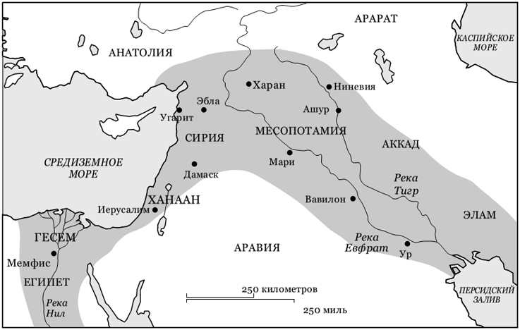 Плодородный полумесяц регион на Среднем Востоке, в котором протекают две огромные реки, Тигр и Евфрат, которые берут начало в горах Турции и Ирана и впадают в Персидский залив; реки обеспечивают регион необходимым запасом воды. Самая плодородная земля находилась в регионе, известном как Месопотамия, который располагался между двух рек; земледелие начало свое развитие там к 9 000 году до н. э. В Плодородном полумесяце росли зерновые культуры, которые можно было «одомашнить» и выращивать, например, полба, ячмень, просо, лен, а также бобовые культуры горошек и чечевица. Началось избирательное разведение коров, коз, свиней и овец из тогда еще диких местных видов (лошади были одомашнены только после 4000 г. до н. э., это произошло на территории России и Центральной Азии). К 7000 г. до н. э. на территории Плодородного полумесяца вовсю развивались крупные фермы, в основном они располагались в регионах, находящихся недалеко от рек или там, где часто шли дожди. Вскоре после 6000 г. до н. э. люди начали использовать простейшую систему орошения, к пятому тысячелетию активно строились искусственные каналы, резервуары для воды, осушались болота, что позволяло более эффективно использовать землю. Добавим к этому изобретение плуга и бороны все способствовало увеличению запасов продовольствия, а значит, и население могло расти быстрее.