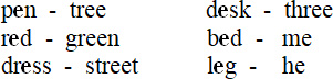 a) pen, bed, desk, pencil, leg, dress, red, ten, left, tree, three, street, he, green, these, me.