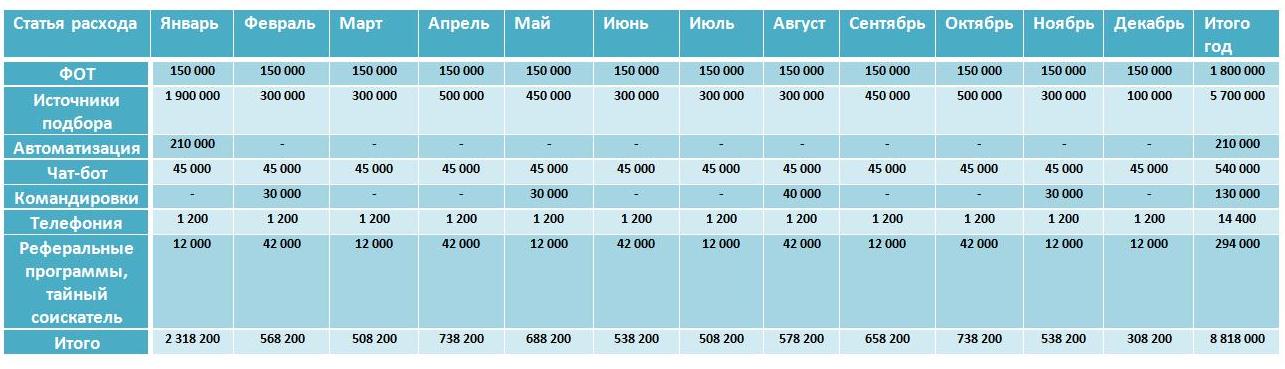 Это основные статьи бюджета, которые мы как руководители отдела подбора персонала защищаем, и согласно которым в дальнейшем работаем. За все остальные статьи расходов, такие как стоимость одного рабочего места, канцелярские товары и т.п. отвечают ответственные сотрудники других подразделений. При необходимости, если вам данная информация нужна для просчета ROI, ее всегда можно запросить.