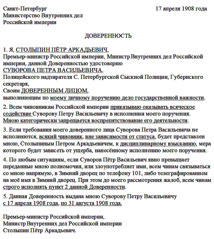 Осмотрев министерскую печать и размашистую роспись Столыпина в правом нижнем углу документа, выполненную широким дорогим пером, твёрдой уверенной рукой, Пётр окончательно понял, что вне зависимости от своего желания и своего отношения он оказался участником очень серьёзной истории, явно попахивающей мистицизмом. Дата на документе говорила о том, что он был подписан премьер-министром вчера.