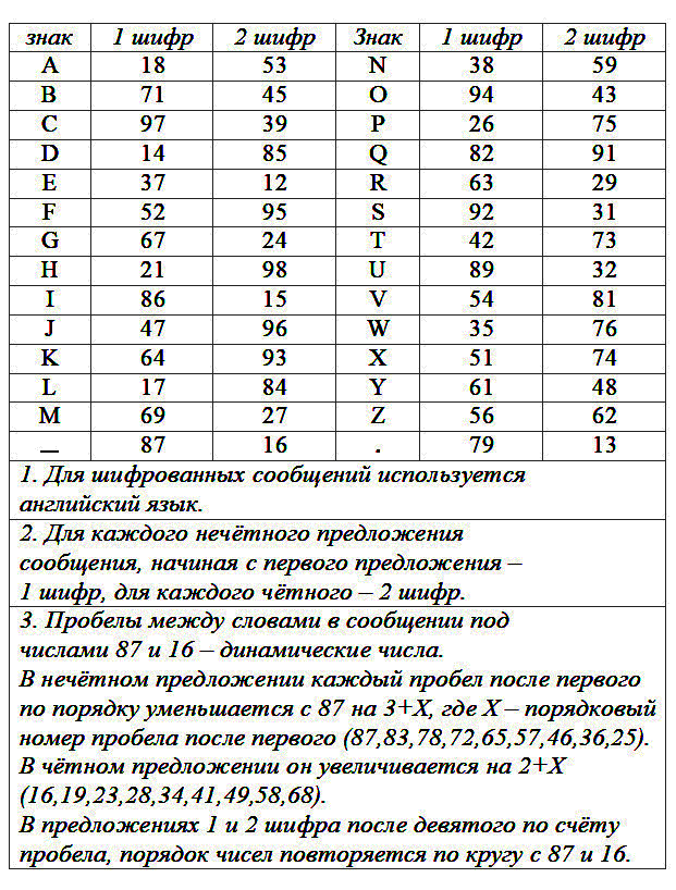 «Довожу до вашего сведения новые данные по СЛТ. Мною установлен точный район их дислокации», на английском языке «I bring to your attention new data on SLT. I have established the exact area of their deployment», в зашифрованном тексте письма или телеграммы выглядело так: