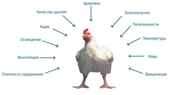 Достижение генетического потенциала, заложенного в птице, зависит от того, насколько все перечисленные на нижеприведенной схеме факторы одновременно и в одинаковой мере учитывались в производстве. Все эти аспекты взаимосвязаны. Если один из них не соблюдается на оптимальном уровне, то это отрицательно влияет на результаты бройлерного производства в целом [21].