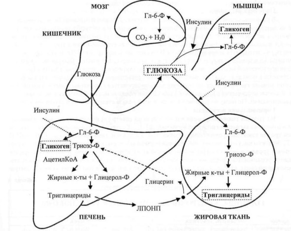 В пищеварительный тракт птицы углеводы поступают с кормом в виде полисахаридов, дисахаридов и моносахаридов. Под действием амилолитических ферментов пищеварительных соков ЖКТ углеводы корма расщепляются до моносахаридов (глюкозы). Всосавшаяся в кровь глюкоза попадает в печень, где 5% ее превращается в гликоген, а остальная часть поступает в кровь и ткани. Часть глюкозы, поступившей из печени в кровь, попадает в мышцы и там превращается в гликоген. Гликоген печени и мышц расщепляется в зависимости от потребностей тканей до глюкозы, которая и используется для энергетических и пластических целей [57].