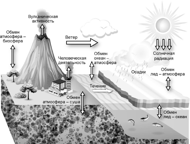 Когда мы говорим о климате, мы подразумеваем в первую очередь состояние атмосферы, точнее, ее нижнего слоя тропосферы. Это неудивительно, поскольку воздух и есть наша среда обитания, а поверхности Земли мы касаемся лишь подошвами ног. Атмосфера постоянно обменивается энергией и веществом с гидросферой, сушей, криосферой и биосферой (рис. 1.6). Вместе они образуют климатическую систему. Атмосфера является самой динамичной составляющей климатической системы, поскольку обладает относительно небольшой массой и низкой теплоемкостью. Поэтому она реагирует на внешние изменения быстро от нескольких часов до недель.