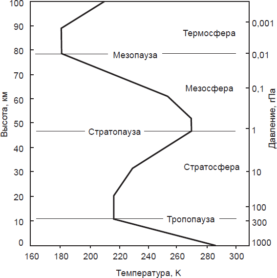 Рис. 1.5. Типичная стратификация атмосферы в средних широтах. От земной поверхности и до тропопаузы с высотой, как правило, становится холоднее. В стратосфере, напротив, температура с высотой растет