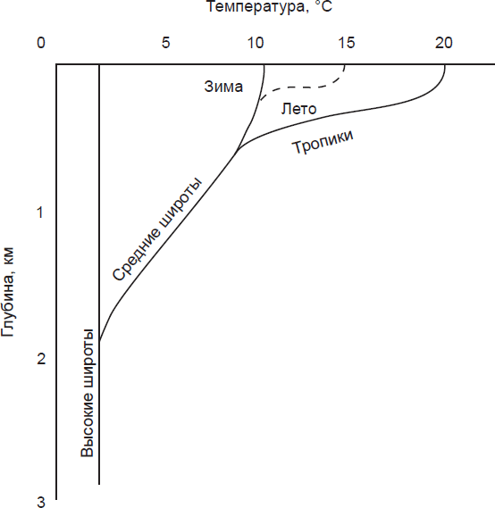 Рис. 1.7. Вертикальное распределение температуры в океане (Knauss, Garfield, 2016). В высоких широтах термоклин не выражен