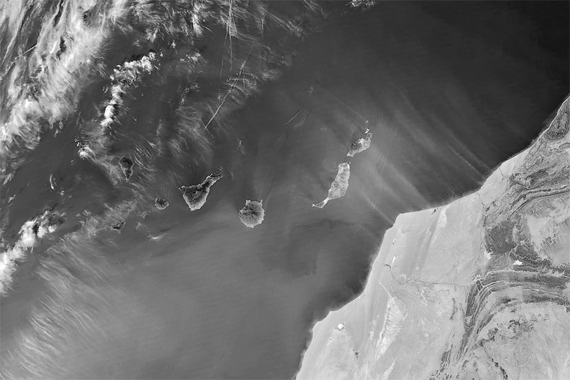 Рис. 1.8. Миллионы тонн пыли из Сахары переносятся ежегодно ветром через Атлантику (Yu et al., 2015). Содержащийся в пыли фосфор ценное удобрение для лесов Амазонки. Приведенный пример является прекрасной иллюстрацией того, что в климатической системе все взаимосвязано. Аэрозоли также поглощают и рассеивают солнечное излучение и служат ядрами конденсации водяных капель, способствуя образованию облаков. На фото пыль из Сахары над Канарскими островами. Источник изображения: NASA