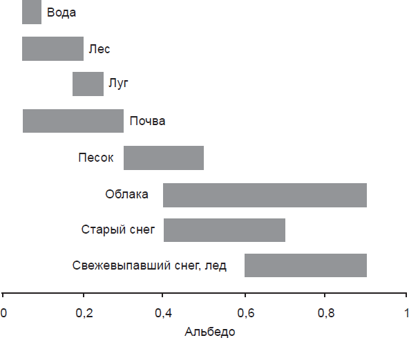 Рис. 1.9. Диапазон значений альбедо различных поверхностей (Ruddiman, 2014). Величина альбедо зависит от угла падения солнечных лучей, поэтому поверхности со сходными свойствами в высоких широтах отражают больше света